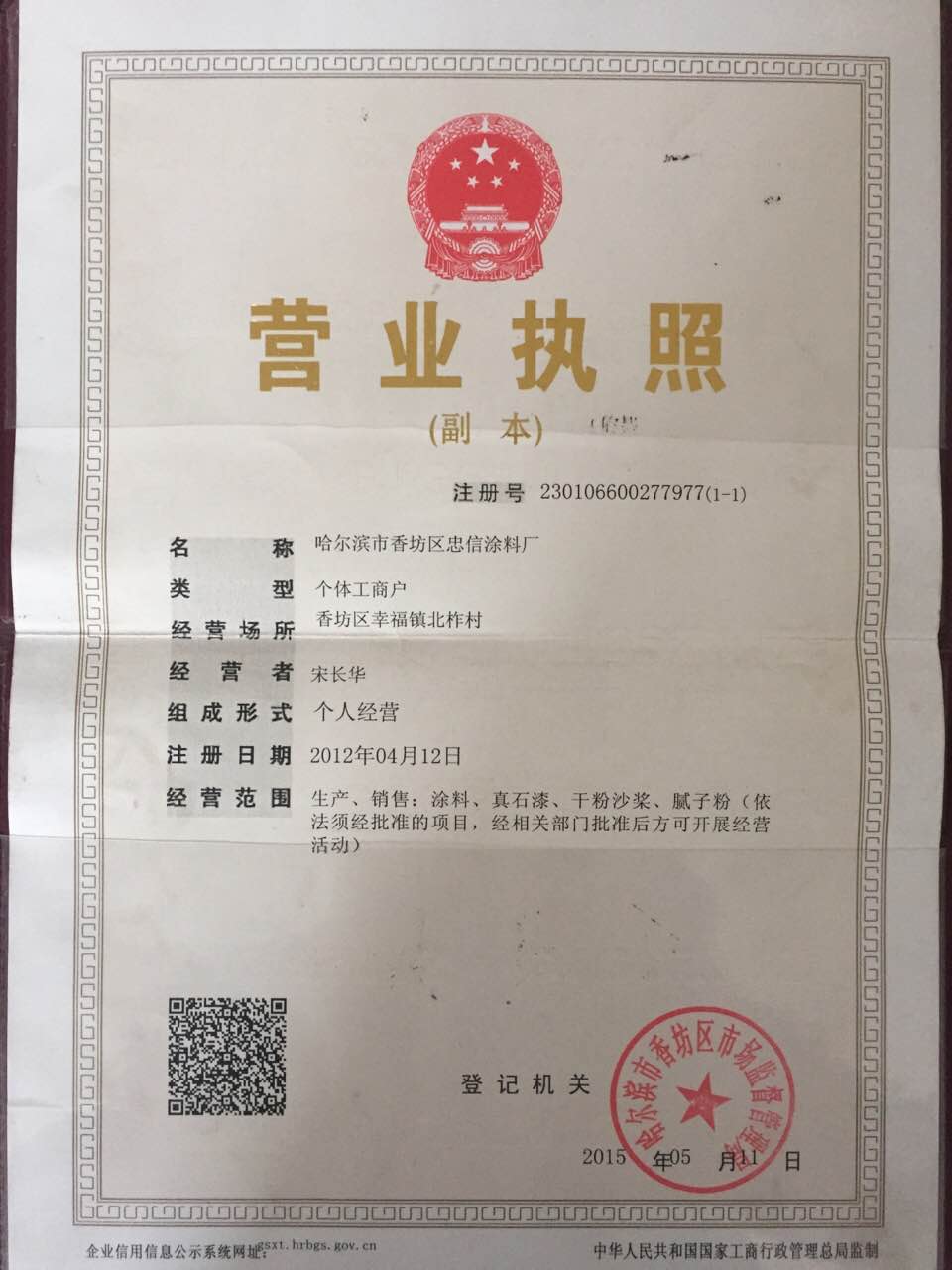 哈尔滨市香坊区忠信涂料厂是一家集安全保护型、功能型、环保型装饰材料的研究开发、规模化生产和产品销售为一体。 通过多年的运作、努力,忠信防水涂料厂在不断的发展壮大。在技术创新与合作以及技术的研发方面,取得了丰硕的成果,创造了较好的经济效益和社会效益。 以“如何极大的满足顾客的需要,达到供需双赢!”为宗旨,在日益竞争激烈的经济行业中处于优越地位。拥有专业生产管理系统,引进国外先进技术和管理经验,组建了一支高水平的技术队伍,并与国外内知名科研机构取得密切合作,严格监控产品质量,具体完善的质量管理,合理的价格标准和优质的售后服务。 其产品行销全国各地,深受广大用户的青睐。用户的肯定是忠信的荣誉,忠信将凭借自身的生产研发优势,管理优势,为更多的用户提供优质健康的建筑装饰材料。
